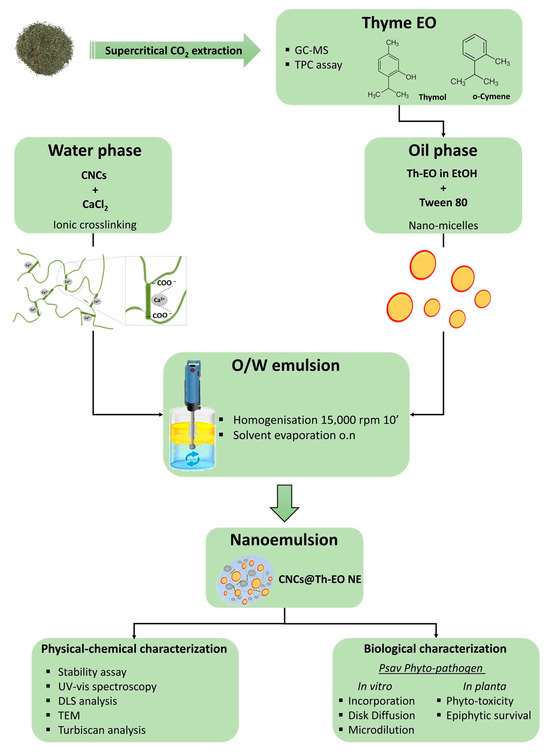 Flowchart of the process studied for the CNCs@Th-EO NE production and methodologies for their characterisation.