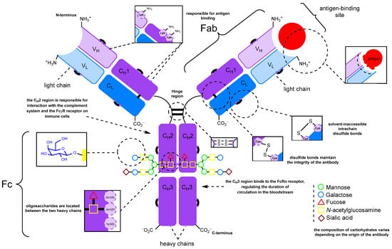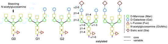 The carbohydrate composition is usually limited to fucose, mannose, galactose, N-acetylglucosamine, and sialic acid (Figure 4). The oligosaccharide structures and possible isoforms depend on the antibody producer and can be predicted [127,128]. For example, CHO cells produce antibodies with varying profiles of glycosylation [129,130,131]. However, obtaining antibodies with a homogeneous isoform of glycans in cellular expression systems is challenging. This is due to the various cellular processes, including the activity of enzymes such as glycosidases, glycosyltransferases, and others [111].
