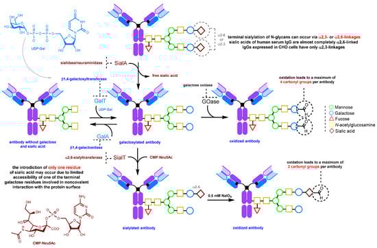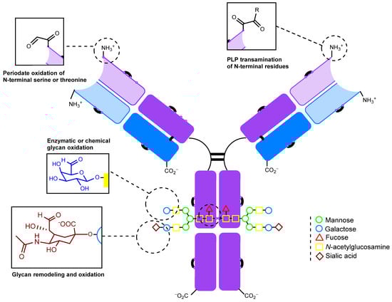 Alternatively, terminal sialic acid residues can be enzymatically introduced into the glycan, followed by their mild oxidation using sodium periodate (0.25–0.5 mM) to form carbonyl groups (Figure 9) [143,152]. For trastuzumab, at NaIO4 concentrations below 1 mM, there is no significant loss of binding (less than 15%) to the FcRn receptor due to methionine oxidation. However, at concentrations above 4 mM, a 40% loss of binding occurs due to the oxidation of methionine residues, in particular Met-252 [143].