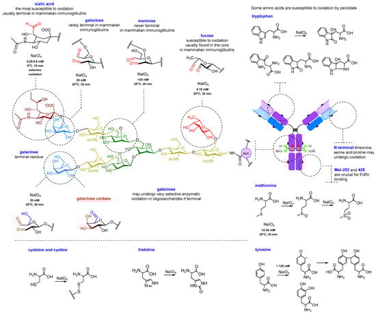 It is important to note that selective oxidation of sialic acid residues with periodate uses much lower concentrations of periodate (0.25–0.5 mM) than conventional oxidation of oligosaccharides [107,136]. These conditions are the most suitable for sensitive amino acids. Oxidation of methionine residues [143,150], including residues Met-252 and Met-428 located on the Fc region of CH3 close to the binding site of the neonatal receptor FcRn (the neonatal fragment crystallizable (Fc) receptor) [154], can affect the efficiency of binding to the latter [143]. This receptor is responsible for the recirculation of the antibody from lysosomes back to the intercellular space, as in the case of nonspecific pinocytosis, and a decrease in the interaction with it significantly reduces the lifetime of the immunoglobulin in the blood [154].