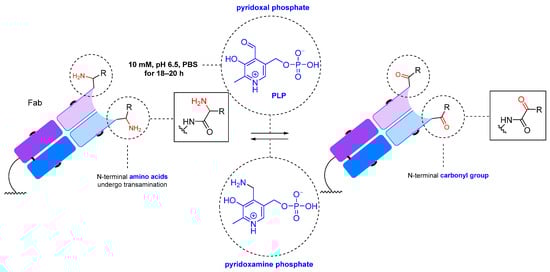Transamination reactions can be used to introduce a carbonyl group at the N-terminus of an antibody of any origin. The reaction involves pyridoxal-5-phosphate (PLP) at 37–50 °C in an aqueous solution (Figure 7) [160,161]. The advantage of this method is its selectivity: it introduces the carbonyl group at the N-terminus without affecting the antigen-binding site. However, a significant disadvantage is that different N-terminal amino acid residues have varying reactivity in the oxidation by pyridoxal-5-phosphate and subsequent modification [162]. For example, alanine, glycine, aspartic acid, glutamic acid, and asparagine form carbonyl products that are easily functionalized by oxime ligation, while the most common N-terminal amino acid, glutamine, is oxidized to a keto derivative that is unreactive toward oxyamines. In addition, some amino acids form adducts with pyridoxal (Figure 8A) [162]. Other disadvantages of this method are the limited number of modification sites (one site per chain, four sites for the whole antibody) and, consequently, a low payload-carrying capacity [160]. In addition, the transamination reaction works best at a temperature of 50 °C, which is undesirable when working with antibodies. Although these limitations hinder the widespread application of this method, it has been successfully applied to create therapeutic drug-loaded Fc antibodies [161].