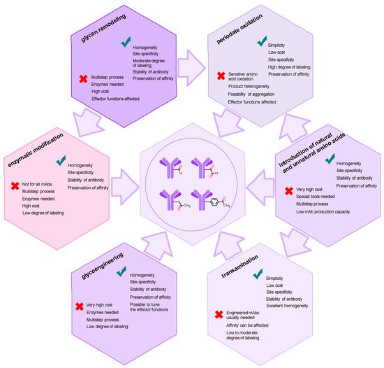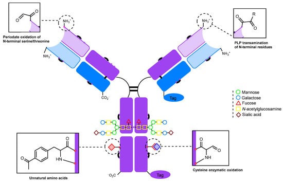 - Placing an amino acid residue of interest into the Fc region or Fab region, far from the antigen-binding site [203]. Subsequent to this step, enzymatic or chemical conjugation can be performed.