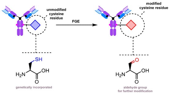 Another strategy involves the enzymatic conversion of cysteine residues to formylglycine (Figure 14). It has been employed for modifying antibodies [213,214,215] and Fc fragments [216].