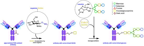 An interesting example of the vast possibilities of genetic engineering is an approach to glycan remodeling using the mutant Endo-S D233Q and a genetically engineered antibody containing a carbonyl group (Figure 15). The carbonyl group is introduced by enzymatic oxidation by first genetically encoding a cysteine residue in place of N297 and then converting it to formylglycine using FGE (formylglycine-generating enzyme), as described previously [217]. The formylglycine residue is further conjugated with an oxyamino GlcNAc derivative. The Endo-S-mediated conjugation with an N-glycan oxazoline completes the assembly process.