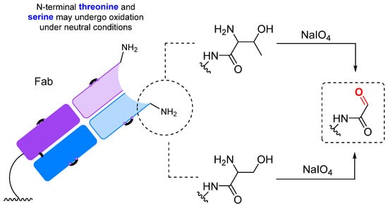 The N-terminal serine and threonine can be selectively oxidized with sodium periodate to form carbonyl compounds [204] (Figure 16). It should be noted that the rate of oxidation of α-amino alcohols and N-terminal amino acids with an OH group in the side chain is significantly higher (approximately 102–104 times) than the rate of oxidation of diols in sugars [218]. However, the rate of oxidation of amino alcohols is highly dependent on pH values. Under acidic conditions, the oxidation of amino sugars is almost completely suppressed due to the protonation of the amino group. In addition, as mentioned previously, at acidic pH valuesl, there is risk of methionine oxidation, while at neutral pH values, the oxidation of Met, Tyr, and Trp is virtually absent [136]. This makes it possible to selectively oxidize N-terminal residues under neutral conditions. In particular, periodate oxidation of the N-terminal serine of the IgG light chain followed by oxime ligation was used to synthesize a highly homogeneous antibody–drug conjugate with a DAR (drug-to-antibody ratio) of 2 [204].