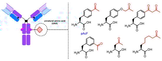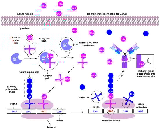 A more complex method of introducing a carbonyl group into the antibody involves the use of unnatural amino acids (UAAs) [109]. These UAAs, which contain a carbonyl group, can be incorporated into the antibody at specific positions using genetic engineering [224]. There are two primary approaches to obtaining such genetically engineered antibodies: a cell-based method (Figure 18) and a cell-free method. A number of reviews are devoted to a detailed consideration of the characteristics of the methods [225,226]. In this review, we will only briefly discuss the cell-based method, as it is more commonly used and better developed in practice.