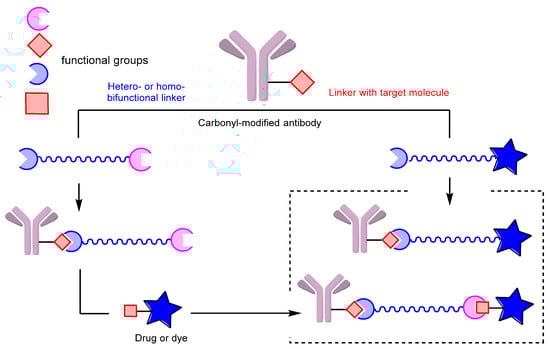 The engineered THIOMAB antibody can be modified with a bifunctional maleimide-carbonyl-containing linker, which introduces a carbonyl group to the antibody for subsequent modification (Figure 13) [211]. In this case, the carbonyl group serves as one of the two reactive handles for the synthesis of a dual-drug antibody–drug conjugate [212].