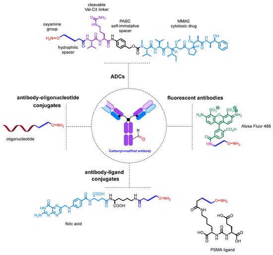 Among the various bioorthogonal reactions available, those involving carbonyl groups are particularly intriguing for several reasons [105]. Carbonyl groups (aldehydes and ketones) (1) are not found in major classes of biopolymers such as proteins, nucleic acids, and polysaccharides; (2) can be site-specifically introduced into biomolecules; and (3) are well suited for bioorthogonal modification reactions, including oxime ligation [106], hydrazone formation [106] or the Pictet–Spengler reaction [105]. Carbonyl groups (aliphatic, aromatic, and α-oxo aldehydes, as well as aliphatic and aryl-alkyl ketones) can be incorporated into immunoglobulin molecules using various methods. This review will focus on the preparation and application of site-specific antibody conjugates, whose synthesis involves the introduction of carbonyl groups into the antibody molecule and their subsequent modification by biorthogonal reactions.