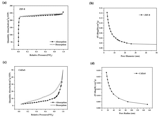 The BET surface area is an important property of porous materials, which is related to the pore structure and pore size of porous materials. A larger BET surface area means that more active surfaces are available for reactions to occur, providing more reaction sites and adsorption sites. This can increase the activity of the photocatalytic reaction because more reactants can make contact with the photocatalyst and react. The specific surface areas and opening distribution curves of pure ZIF-8, CdZnS, and CdZnS@ZIF-8 were measured by N2 adsorption and dissolution experiments. As shown in Figure 3a,e, the adsorption–desorption isotherm of pure ZIF-8 and the composite material CdZnS@ZIF-8 has a sharp adsorption inflection point in the low-pressure range of 0–0.1, which is a typical type I curve. There is a well-shaped platform at high relative pressure, which indicates microporosity [37]. CdZnS, as shown in Figure 3c, presents a type III isotherm and is a microporous solid material. The interaction between the adsorbed material and the adsorbed gas is relatively weak, and the adsorbed molecules are concentrated around the most attractive parts of the surface. At the same time, it can be seen from Figure 3e that the hysteresis curve is of H4 type, indicating that in addition to the microporous structure, the synthesized composite material has some mesoporous structures similar to those generated by the layered structure [38,39]. In addition, it can be seen from Table S1 that the BET specific surface area of the composite material is 1151.684 m2g−1, which is slightly smaller than that of ZIF-8 (1836.352 m2g−1) and much larger than that of CdZnS (12.662 m2g−1). It may be that ZIF-8 wraps around CdZnS. By analyzing the Barrett–Joyner–Halenda (BJH) pore size distribution of the CdZnS@ZIF-8 composite (Figure 3f), the composite has a three-stage pore structure with micropores, mesoporous pores, and macropores. The results show that CdZnS@ZIF-8 composites with multistage pore structures can reflect and absorb incident light many times on the one hand, and accelerate the transfer efficiency and mass diffusion in the photocatalytic process on the other hand.
