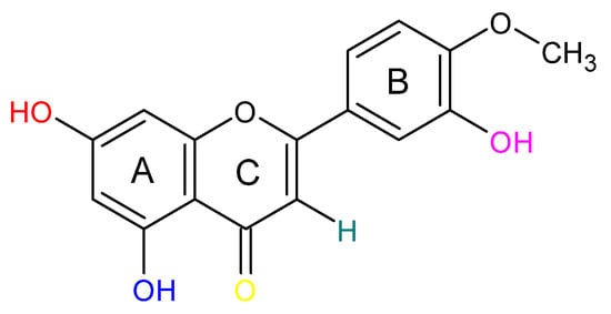In this work, we present a review of the literature on the possibility of modifying the structure of diosmetin to obtain biologically active compounds. We assume that the substrate for the synthesis was diosmetin and that a necessary element of the structure of the final compounds was the skeleton marked in black in Figure 1. The modification sites are marked with colors.