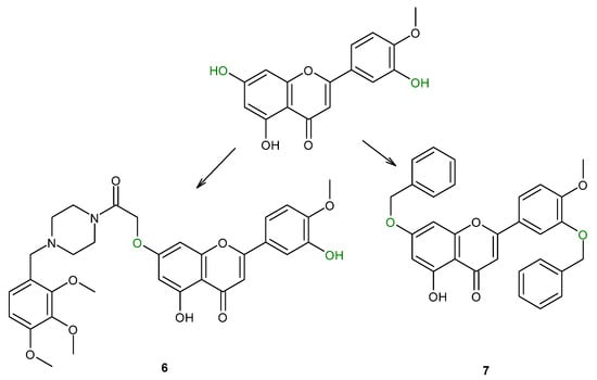 - Cheng, N.; Yi, W.B.; Wang, Q.Q.; Peng, S.M.; Zou, X.Q. Synthesis and α-Glucosidase Inhibitory Activity of Chrysin, Diosmetin, Apigenin, and Luteolin Derivatives. Chin. Chem. Lett. 2014, 25, 1094–1098. [Google Scholar] [CrossRef]