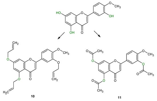 T Kim-Dung Hoang published the synthesis and results of biological activity investigations of O-alkyl and O-acyl flavonoid derivatives [30]. The reagents used in the reactions were dimethylsulfate and allyl bromide. The authors state that the alkylation of the 5-OH group in the flavonoids depends not only on the alkylating reagent used but also on the structure of ring B in the flavonoids. The synthesized compounds were evaluated for their biological activities. Two specific tests were conducted: inhibition of bovine serum albumin denaturation and anti-inflammatory activity. In vitro tests assessed the ability of the compounds to inhibit the denaturation of bovine serum albumin. Denaturation of proteins can be a sign of inflammation and other pathological processes. Some compounds that showed significant inhibition of albumin denaturation were further evaluated for their anti-inflammatory activity. The study revealed that certain flavonoids effectively reduced carrageenan-induced paw edema, indicating their potential as anti-inflammatory agents. In the next step, in vitro antiproliferative activity was tested in the estrogen-dependent breast cancer cell line MCF-7. The IC50 values for all compounds were higher than camptothecin, which was used as a reference drug. The most active was the derivative of hesperetin, with an IC50 value of 0.020 µM/mL whereas for the diosmetin derivative 10 and 11 (Figure 6) the IC50 values were 0.035 µM/mL and 0.190 µmol/mL, respectively.
