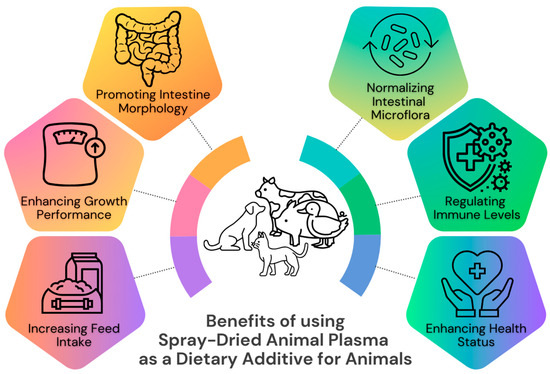Potential health and welfare benefits of spray-dried animal plasma as a dietary additive for livestock and pets based on [2,4,5,6,7,8,9,10,11,12,13,14,15].