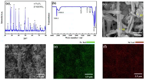 Characterization of as-prepared Nd-Fe-B precursor. (a) XRD pattern, (b) IR spectra, (c,d) SEM image, and elemental mapping of (e) Fe and (f) Nd of the Nd-Fe-B precursor.