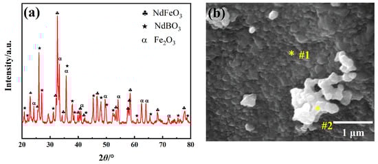 SEM was employed to characterize further the Nd-Fe-B oxide generated at 800 °C. According to Figure 2b, the structure of the Nd-Fe-B oxide consists of lamellar particles (region #1, marked as “*”) and equiaxed, agglomerated particles (region #2, marked as “*”), with particle diameters below 200 nm. The EDS scans show that the lamellar particle of the region marked #1 consisted of 24.3 at% Nd, 30.3 at% Fe, and 45.4 at% O (see Figure S4, Supplementary Information). The particles, as depicted in Figure 2a, are determined to be NdFeO3 grains. The equiaxed particle marked #2 comprises 39.5 at% Fe and 60.5 at% O, indicating that the area contains a large amount of Fe2O3 (see Figure S5, Supplementary Materials).