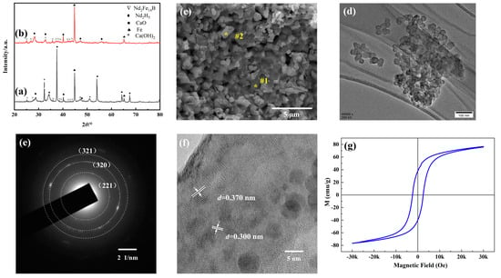 Characterization of as-prepared Nd−Fe−B magnetic particles. XRD pattern of the product (a) before washing and (b) after washing, (c) SEM image, (d) TEM micrograph, (e) SAED pattern, (f) HRTEM image, and (g) hysteresis loops at room temperature of Nd-Fe-B magnetic particles.