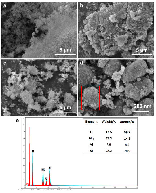 SEM images of (a) MCM-41, (b) LDO, (c,d) LDO/MCM-41, and (e) SEM–EDS analysis of the specified red box area.