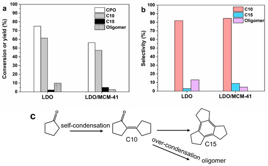 (a) Comparison of conversion (white bar), yield of C10 yield (grey bar), C15 (black bar), and oligomer (patterned bar) on LDO and LDO/MCM-41. (b) Selectivity of C10 (red bar), C15 (blue bar), and oligomer (purple bar). Reaction conditions: 0.2 g catalyst, 2.0 g CPO, 160 °C, 5 h. (c) The reaction route of CPO self- condensation.