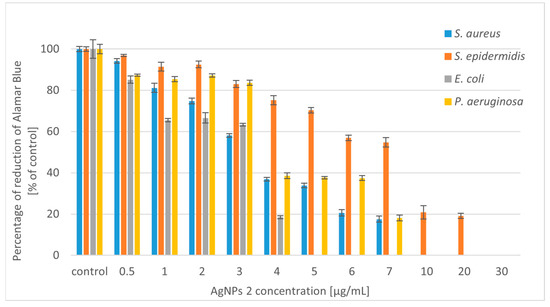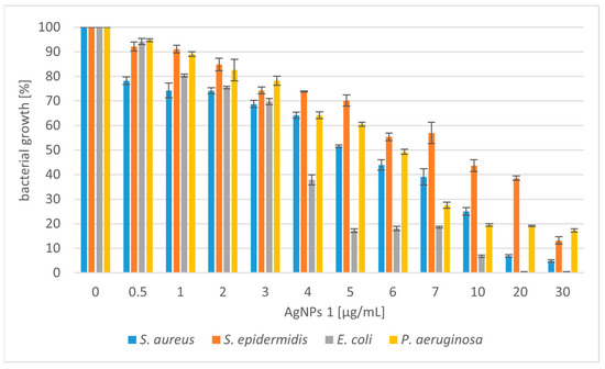 The experimental results showed that AgNPs 2 has a stronger effect on the tested bacterial strains. Higher activity of the tested compounds against Gram-negative strains was also observed. In the case of Gram-positive bacteria, it was necessary to use higher concentrations of compounds. The use of concentrations of both tested nanoparticles below 5 µg/mL reduced the growth of S. aureus from 20 to 60%. Moreover, their slightly lower activity against S. epidermidis was noted. At higher concentrations, the tested silver nanoparticles caused 80–90% growth inhibition of the Gram-positive microorganisms. E. coli was the most sensitive strain to the tested compounds. The bactericidal effect was obtained at a concentration of 20 µg/mL for AgNPs 1 and 7 µg/mL for AgNPs 2. At lower concentrations of both compounds (4–5 µg/mL), satisfactory results were also obtained for E. coli (50–60% growth inhibition). Nanoparticles also showed good antibacterial activity against P. aeruginosa. However, the strain was less sensitive compared to E. coli. When higher concentrations of nanoparticles (above 10 µg/mL) were added to the P. aeruginosa culture, the growth inhibition was 80%.