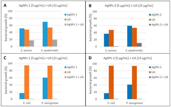 Synergistic effect of AgNPs and ursolic acid against Gram-positive bacteria: Staphylococcus aureus and Staphylococcus epidermidis ((A) AgNPs1 and (B) AgNPs 2) and Gram-negative bacteria: Escherichia coli and Pseudomonas aeruginosa ((C) AgNPs 1 and (D) AgNPs 2).