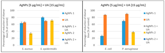 The combined antibacterial activity of silver nanoparticles (AgNPs 1 or AgNPs 2) and ursolic acid (UA) was investigated using the same method.
