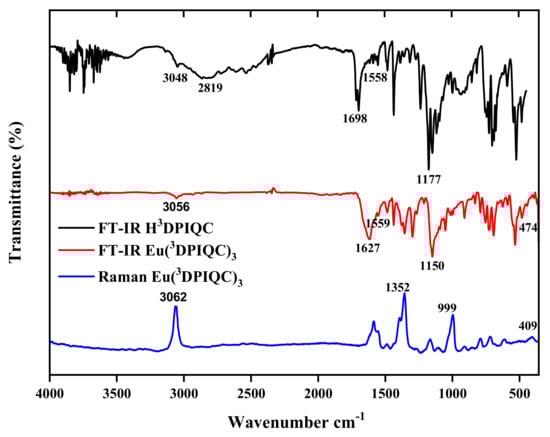 FT-IR spectra of the H3DPIQC ligand (black) and Eu(3DPIQC)3 complex (red) and Raman of the Eu(3DPIQC)3 complex (blue).
