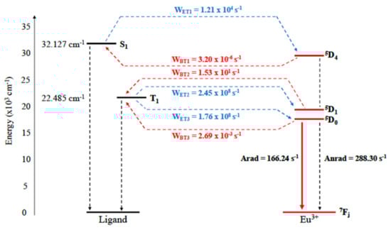Judd–Ofelt theory serves as a valuable tool for the analysis of f-f inner shell electronic transitions. Within Judd–Ofelt theory, the dipole strengths are described by three phenomenological parameters: Ωλ (λ = 2, 4, 6) [44,46,59]. The experimental Ωλexp parameters were derived from the luminescence spectra by correlating the emission intensities to the integrated areas under the emission bands in the luminescence spectrum using LUMPAC. Theoretical intensity parameters Ωλcalc have also calculated from the geometry obtained from the optimized RM1/Sparkle model [60]. Energy transfer rates have been obtained using the model proposed by the group of O. L. Malta [61].
