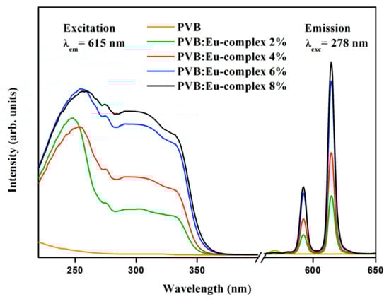 Excitation (λem = 615 nm) and emission spectra (λex = 278 nm) for the 5D0 → 5Dj transition in Eu complex with different proportions of Eu3+ embedded in the PVB matrix.