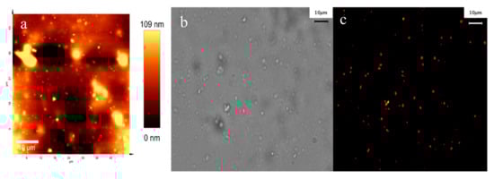 Two-dimensional AFM image of PVB: Eu6% (a). Dark field (b). Fluorescence microphotography of PVB:Eu6% (c).