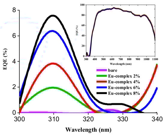 The photocurrent density (Jsc) of the PV device was determined by integrating the EQE in the 300–1100 nm range (see Figure 7). The relationship between the Jsc and Eu complex concentration in PVB is shown in Table 2. It is possible to observe that the Jsc value exhibits a slight variation up to the 3% concentration, followed by a slight increase at the 6% concentration. However, the photocurrent starts decreasing again as the concentration reaches 8% of the Eu complex. According to Regalado-Perez et al., this finding can be explained using the Lambert–Beer law [30]. As the concentration of Eu in the LDSL increases, a larger number of short wavelength photons are absorbed and converted into red photons, resulting in an increase of the photocurrent. While the absorbance is an exponential function of the concentration, the relationship between Jsc and the Eu concentration shows a maximum at Eu:6%. This has been interpreted considering that a rise in Eu complex concentration within the PVB matrix will also obstruct the utilization of incident light on the cell, resulting in a decrease in the cell’s efficiency. The open circuit voltage (Voc) does not depend on the Eu complex concentration, whereas the fill-factor (FF) shows only a slight nonsystematic variation with the Eu concentration. Our results show that the Jsc of the solar cell containing the LDSL is increased from 30.45 mA/cm2 for the bare cell to 31.10 mA/cm2 for the Eu:6% coated cell.