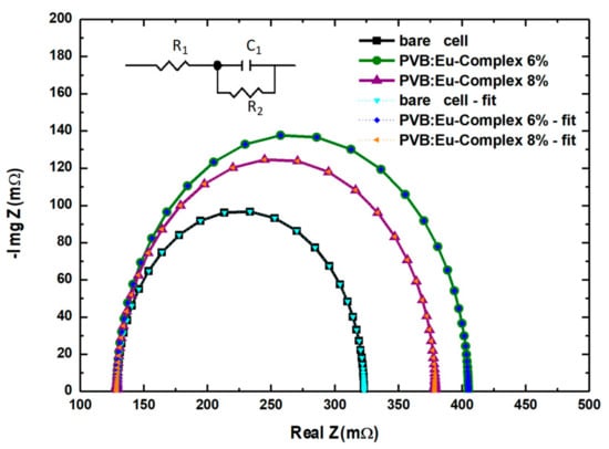 To further understand the charge transport properties of the cells before and after the deposition of the LDSL, Electrochemical Impedance Spectroscopy (EIS) measurements were carried out at their open circuit potential over a frequency range of 10−3–105 Hz by means of a OrigaFlex BiPotentiostat. Figure 9 displays a Nyquist plot illustrating the experimental results for the pristine solar cells, as well as for those with LDSLs containing 6% and 8% of the Eu complex. The observed semicircles have been carefully fitted to the equivalent circuit (RC), as depicted in the box, utilizing the ZView 3.2b software. These spectral patterns are consistent with previous literature reports that typically show a single semicircle for this type of solar cell [54,55].