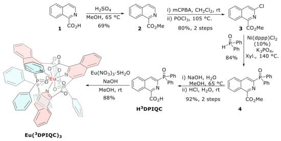 Eu(3DPIQC)3 was synthetized following the procedure described in ref. [28]. The synthesis began with the esterification of 1-isoquinolinecarboxylic acid (1), followed by N-oxidation and chlorination with POCl3, obtaining chloroisoquinoline 3 in a 55% yield (three steps). The next step, a C-P cross coupling, gave low yields with the originally described procedure between compound 3 and diphenylphosphine oxide (DPPO). For this reason, it was necessary to perform an optimization of the nickel-catalyzed procedure (see Table S1 in Supplementary Materials), finding that the best conditions to obtain isoquinoline 4 were using Ni(dppp)Cl2 (10 mol%) as catalyst and K3PO4 as the base in xylene at 140 °C (under argon atmosphere), allowing the desired product to be obtained at an 84% yield on a scale of up to 4.0 mmol. The tridentate ligand H3DPIQC was obtained via the hydrolysis of the methyl ester using NaOH in MeOH, followed by neutralization with HCl. Finally, the Eu(3DPIQC)3 complex was prepared by a deprotonation of the ligand with NaOH and one third equivalent of Eu(NO3)3·5H2O in MeOH, achieving a 88% yield. The synthesis steps are detailed in Scheme 1.