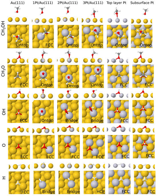 From an analysis of Table 1 (and Tables S1–S5 of the Supplementary Materials) we can observe that, with the exception of CH3OH, which was rather weakly adsorbed on all surfaces, all species showed strong affinity toward both the clean Au(111) and the various Pt-doped surfaces. For CH3OH, only the on-top adsorption position was moderately stabilized by Pt doping in the topmost layer (of about 0.3 eV), while on the clean Au(111) surface no adsorption site was strongly preferred over another. For CH3O adsorption, the two available high-symmetry sites (on top an fcc) were equally stable on clean Au(111). As the Pt:Au ratio increased, an enhancement in stability was observed, with the Pt overlayer displaying a clear preference towards fcc and hcp sites over the on-top site. Conversely, the presence of a Pt sublayer had little effect on methoxy adsorption compared to the clean Au surface. The adsorption energies of OH and the atomic species were already quite large on Au(111). However, a clear trend of increasing stability with an increasing surface Pt-doping concentration when going from 1 Pt/Au(111) to 3 Pt/Au(111) could easily be discerned, irrespective of the adsorption site. Pt doping in the form of a full Pt layer had the effect of either moderately decreasing the stability of the adsorbates (when in the form of an overlayer) or causing a noticeable decrease in the stability of the adsorbates (when in the form of a surface sublayer).