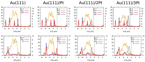 The electronic effect of Pt doping that enhanced the surface affinity towards methanol and methoxy could be observed in the PDOS profiles of adsorbed methanol and methoxy, reported in Figure 3. In contrast to the disjointed appearance of the Au d and methanol states on the bare Au(111) surface, the Pt-doped surfaces exhibited some overlap between the Pt d and methanol states just below the Fermi level. In the case of methoxy, on the other hand, the overlapping states in the energy range of 3–5 eV below the Fermi level were clearly visible.