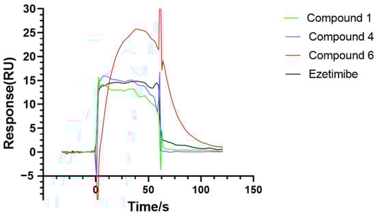 Based on the SPR principle, the Biacore instrument was used to analyze the interaction (ezetimibe, compounds 1, 4, 6) with NPC1L1.