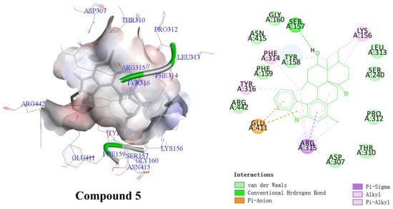 The α-glucosidase inhibitory activity of 1–6 was preliminarily investigated. The results showed that compound 5 exhibited inhibitory activity against the α-glucosidase from Saccharomyces cerevisiae with an IC50 value of 29.22 ± 0.83 μM, while the IC50 value of acarbose was 387.27 ± 19.02 μM (Table 2). To investigate the binding modes of compound 5 with α-glucosidase, molecular docking studies were carried out using Autodock Vina with the crystal structure of isomaltase from Saccharomyces cerevisiae (PDB ID: 3A4A) [22,23]. According to the docking results, compound 5 could generate significant interactions with the amino acid residues Lys156, Arg315, Glu411, Arg442, Tyr316, Phe314, Tyr158, and Ser157 in the isomaltose (Figure 7), respectively.