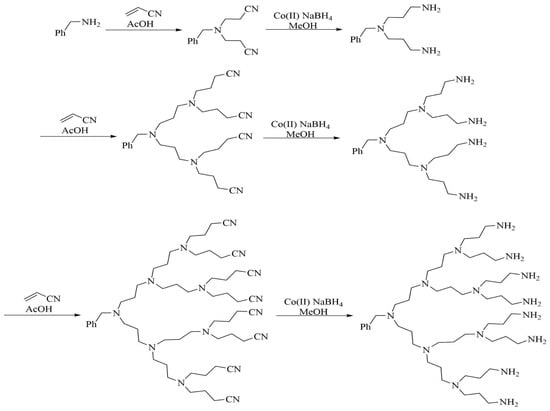 As early as 1952, American scholar Flory [11] investigated the potential of synthesizing highly branched macromolecules from multifunctional monomers. However, this research did not garner significant attention at the time. It was not until 1978 that Fritz Vogtle at the University of Bonn [12] first attempted to synthesize branched molecules utilizing the Michael addition reaction. By connecting three acrylonitrile groups to a nitrogen atom in an amino group, followed by reducing the nitrile group to primary ammonia and repeating the Michael addition reaction, Vogtle successfully obtained PPI small molecules. This innovative small molecule doubles the number of branched structural units per reaction generation, ultimately forming branched large molecules akin to branch structures in the fifth generation. Figure 2 shows the synthetic route of the PPI.