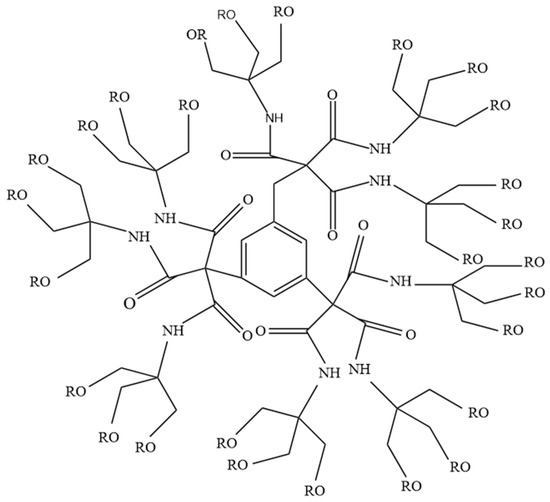 Polymers with a dendritic structure possess a highly branched architecture, enabling extensive modification of the functional groups at their terminals. This results in outstanding characteristics, such as high fluidity, low viscosity, and excellent solubility [15], which make these materials exceptionally suitable for applications in supramolecular chemistry, nanomaterials, catalysts, and petrochemicals.