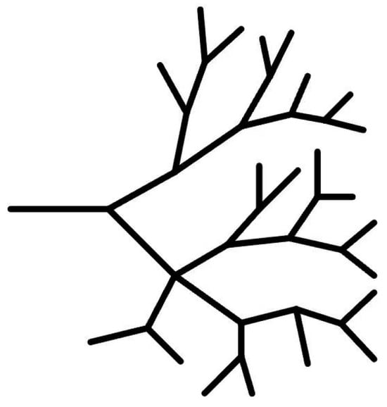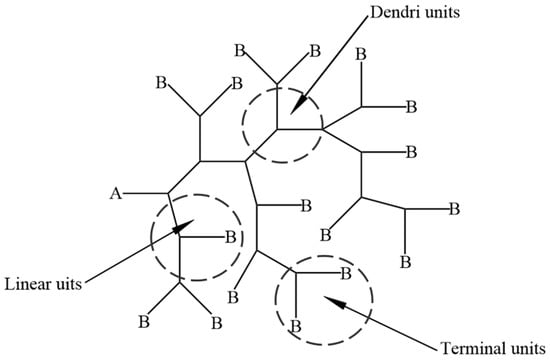 Nonetheless, the highly symmetrical structure of dendritic polymers often necessitates numerous labor-intensive purification processes during synthesis, resulting in increased synthesis costs and limited production fault tolerance. Numerous unfavorable factors have impeded the advancement of dendritic polymer research [16]. Subsequently, it has been recognized that such an idealized symmetrical structure is not always essential. Consequently, hyperbranched polymers, which inherit the majority of dendritic polymers’ advantages despite possessing less symmetrical structures and relaxed synthetic conditions, have emerged in the scientific community’s field of vision. Figure 4 illustrates the molecular structure of a hyperbranched polymer.