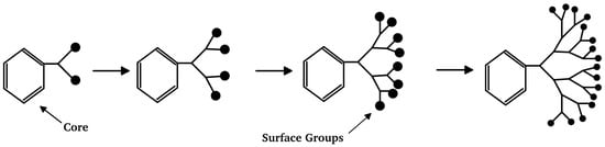 Divergent synthesis, initially proposed by Vogtle and Buhleier [12], was further developed by Tomalia and Newkome [14,21]. This synthetic approach involves the initiation of polymerization steps progressively from the core of an initial core possessing a reactive functional group, gradually expanding the reaction sequence, and ultimately synthesizing a dendritic polymer. Figure 5 shows the schematic diagram of the divergent synthetic method.