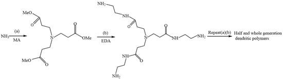 Synthetic route of dendritic polymer with ammonia as core: (a) ammonia and methyl acrylate (MA) by Michael addition reaction to form ternary ester (0.5 G); (b) ternary ester reacts with excess ammonia to form ternary amide compound (1.0 G).