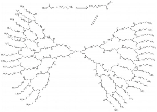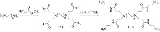 Polymers with a branched structure were synthesized by Li Jie et al. [22] using a divergent synthetic method that employed ethylenediamine as the initiator core. Initially, a Michael addition reaction was conducted to react ethylenediamine with methyl acrylate, resulting in the formation of a quaternary ester (a half-generation 0.5 G reaction product). Subsequently, the quaternary ester underwent an ammonolysis reaction with excess ethylenediamine to generate a quaternary ester amine complex (a first-generation whole-generation reaction product). Finally, the aforementioned Michael addition and ammonolysis reactions were reiterated to produce PAMAM dendrimers of varying generations [23]. Figure 6 shows the synthetic route of a dendritic polymer with ammonia as its core.