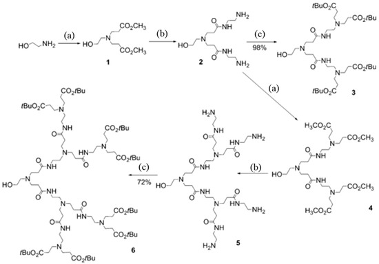 Synthesis of dendrons 1–6. Reagents and conditions: (a) methyl acrylate, MeOH, RT, and 3 days; (b) ethylenediamine, MeOH, 80 °C to RT, and 3 days; and (c) tert-butyl acrylate, MeOH, RT, and 3 days.