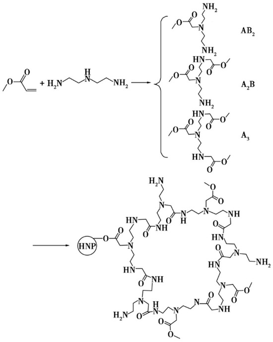 The synthesis of the hyperbranched polyamide matrix HBP-NH2 by Qian Kai et al. [33] was achieved via the ABx-type monomer self-condensation method using methyl acrylate, diethylenetriamine, and methanol as raw materials. Subsequently, HBP-NH2 was modified with sodium acrylate to terminate the amino group, resulting in the synthesis of a carboxyl-terminated hyperbranched polymer, HBP-COOH, which exhibits scale-inhibitory properties. The corresponding reaction scheme is shown in Figure 12.