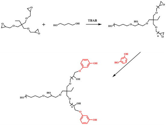 Polymers containing hydroxyl groups with tetrabutylammonium bromide (TBAB) as a phase-transfer catalyst and trimethylpropane triglycidyl ether, butanediol, and ortho diphenol as raw materials were synthesized by Xiao et al. [36] via ring-opening polymerization and condensation reactions, respectively. The synthetic route is shown in Figure 13.