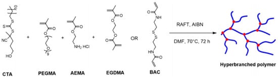 Marasini et al. [39] synthesized hyperbranched polymers by employing N,N-dimethylformamide (DMF) as the solvent via a free-radical polymerization process. In this reaction, 4-cyano-4((dodecylsulfonylthiocarbonyl)sulfanyl)pentanol (CTA), polyethylene glycol methyl methacrylate (PEGMA), 2-aminoethyl methacrylate hydrochloride (AEMA), and ethylene glycol dimethacrylate (EGDMA) or N,N-di(acryloyl)hydrazine (BAC) were utilized as monomers, with 2,2′-azobis(2-methylpropionitrile) (AIBN) serving as the initiator. The reaction pathway is shown in Figure 14.