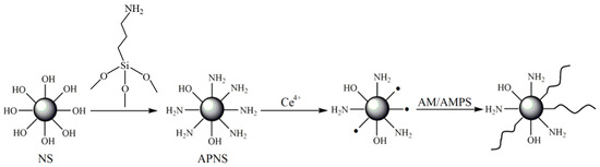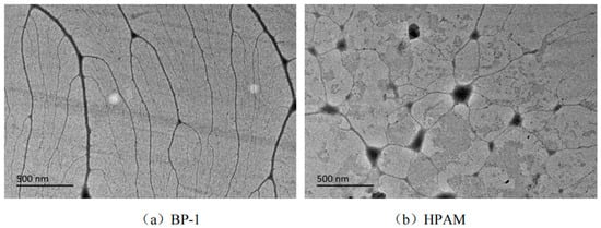 Modified nano-silica particles with different molecular weights were used as cores by Lv Fei from the China University of Petroleum (East China) [43]. Cerium ammonium nitrate was employed as the initiator, while acrylamide and 2-acrylamido-2-methylpropane sulfonic acid served as monomers. Via experiments, free-radical polymerization was employed to optimize the synthetic conditions of the branched polymers and select the samples with the best performance. Consequently, two branched polymers, BP-1 and BP-2, were synthesized under optimal conditions. The synthesis steps of the polymer are illustrated in Figure 15, while Figure 16 presents TEM micrographs of the polymer in deionized water. Compared with the linear polymer HPAM, BP-1 and BP-2 displayed stable three-dimensional highly branched spatial network structures and anti-cationic compressibility, which ascribed them outstanding salt resistance. Core displacement experiments were conducted on the solutions of the branched polymers BP-1 and BP-2, as well as the linear polymer HPAM. The physical simulation oil displacement capabilities of the three polymers (BP-1, BP-2, and HPAM) were investigated at 80 °C. The results revealed that the recovery rates after the injection of BP-1, BP-2, and HPAM increased by 18.9%, 16.5%, and 11.4%, respectively, compared with water flooding. The micro oil displacement performance test results of the three polymer solutions demonstrated that BP-1 exhibited the highest final recovery rate of 67.0% (BP-2 and HPAM had final recovery rates of 63.6% and 56.8%, respectively). This indicates that the oil displacement performance of branched polymers is significantly better than that of linear polymers. Furthermore, the author suggests reinforcing research on the dissolution rate of branched polymers. Considering the synthesis cost, the branched polymer BP-1 with polyethylene imine as the core demonstrates stronger applicability.