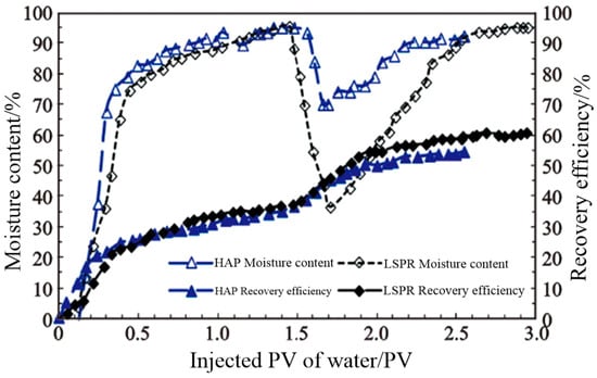 Hu et al. [45] developed and synthesized a long-term shear-resistant polymer, LSRP, to address the practical requirements of offshore oil fields and enhance the temperature and salt resistance of polymers in complex oil reservoir environments. The schematic diagram in Figure 17 illustrates the monomer structure of the polymer, wherein D and T represent regular repeating units characterized by branched structures. Meanwhile, L1 and L2 denote linear repeating units with irregular structures. This polymer employs polyamine methyl acrylate as its polymerization precursor and possesses a hyperbranched structure, categorizing it as a polyamide amine monomer. A core oil displacement experiment was conducted, with the experimental outcomes presented in Table 1 and Figure 18. The data reveal that under identical crude oil viscosity and temperature conditions, HAP flooding can enhance oil recovery by approximately 6%. Furthermore, despite an increase in crude oil viscosity, LSRP flooding can significantly improve oil recovery. To validate the effectiveness of the polymer, on-site experiments were conducted in the Bai21 well area of Xinjiang, which features pronounced interlayer and intra-layer heterogeneity, severe water coning, water channeling, and water fingering. During the experiment, a smooth injection of 30 tons of LSRP dry powder was achieved, followed by a steady increase in the injection well pressure without any obstructions or abrupt pressure spikes. Moreover, no issues with solubility or foaming were encountered in the preparation equipment, indicating that the polymer effectively impedes flow resistance within oil reservoirs and exhibits excellent shear resistance.