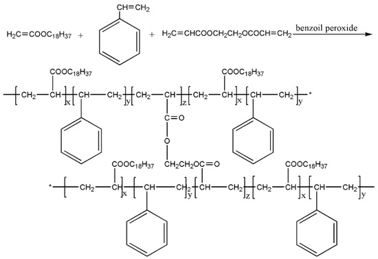 Polymers have been synthesized by Zheng et al. [53] for the viscosity reduction of heavy oil, utilizing octadecyl methacrylate, styrene, and ethylene glycol dimethacrylate as raw materials. Figure 20 shows the preparation of the viscosity reduction process. The results of the viscosity reduction experiment demonstrate that a reduction rate of over 60% can be achieved when the concentration of heavy oil is 800 ppm. By analyzing the effects of varying concentrations of viscosity-reducing agents on the settlement point, settlement amount, and asphalt particle size, it was determined that this hyperbranched polymer viscosity reducer enhances the settlement point of asphalt and markedly reduces the settlement amount and average particle size of asphalt. The formation of asphaltene is inhibited by altering the polarity of asphaltene molecules, generating hydrogen bonds, dispersing asphaltene molecules, adsorbing or embedding asphaltene molecular fragments, and other approaches. This polymer exhibits excellent dispersion and inhibition effects on asphaltene precipitation. The synthesis of this hyperbranched polymer viscosity reducer significantly reduces the cost while ensuring high performance.