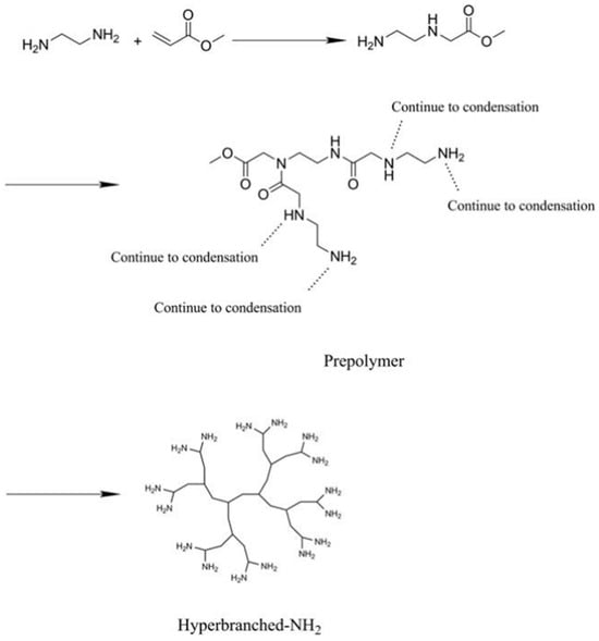 Zhang et al. [49] synthesized hyperbranched polyamine (H-PAMAM), possessing remarkable demulsification capabilities, via a “one-pot multi-step” method using methyl acrylate and ethylenediamine as synthetic materials. Figure 19 shows the synthetic route of H-PAMAM. Characterized by its hyperbranched topological structure and abundant amino groups, H-PAMAM demonstrates rapid action. The demulsification equilibrium can be achieved within merely 30 min, accompanied by a remarkable degreasing rate of 91%. Moreover, the product obtained via this method necessitates no purification, thereby reducing the overall synthesis cost.